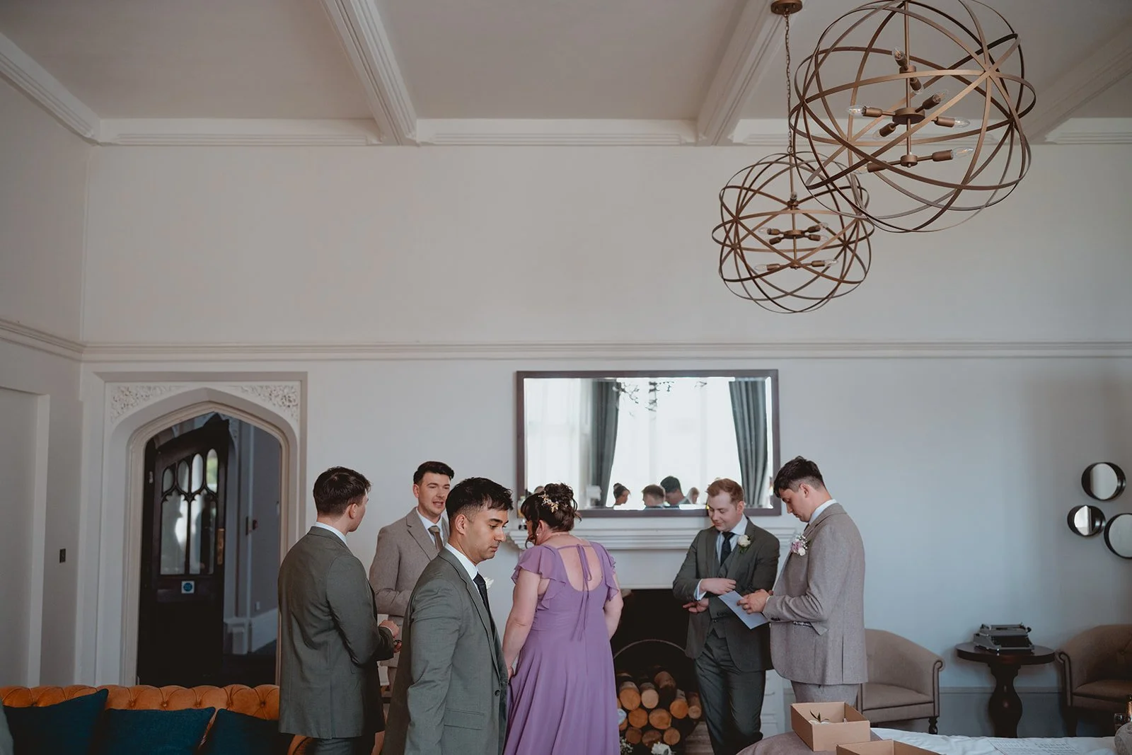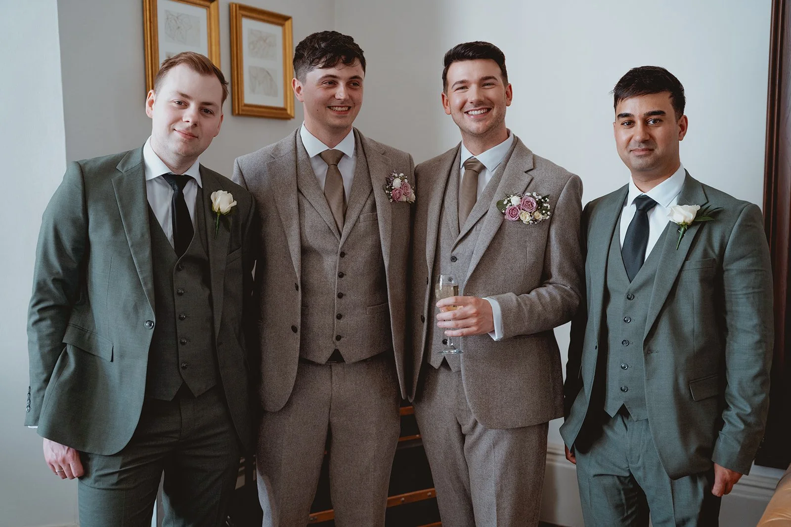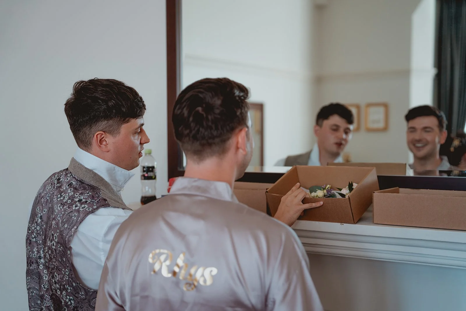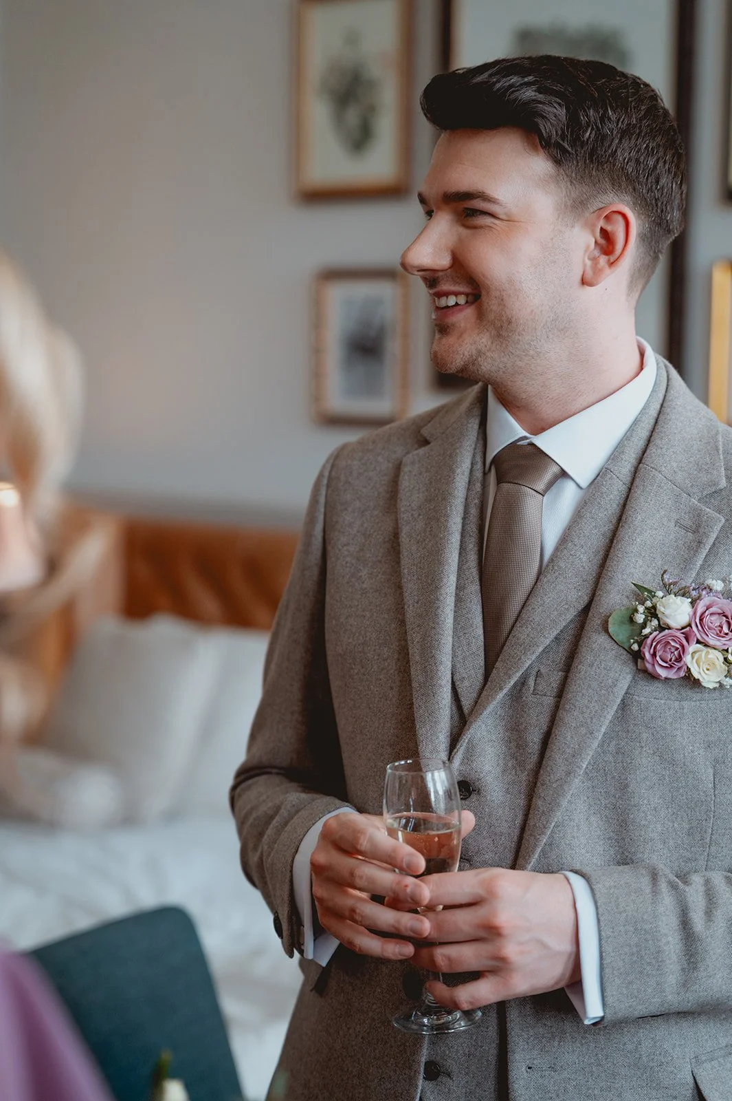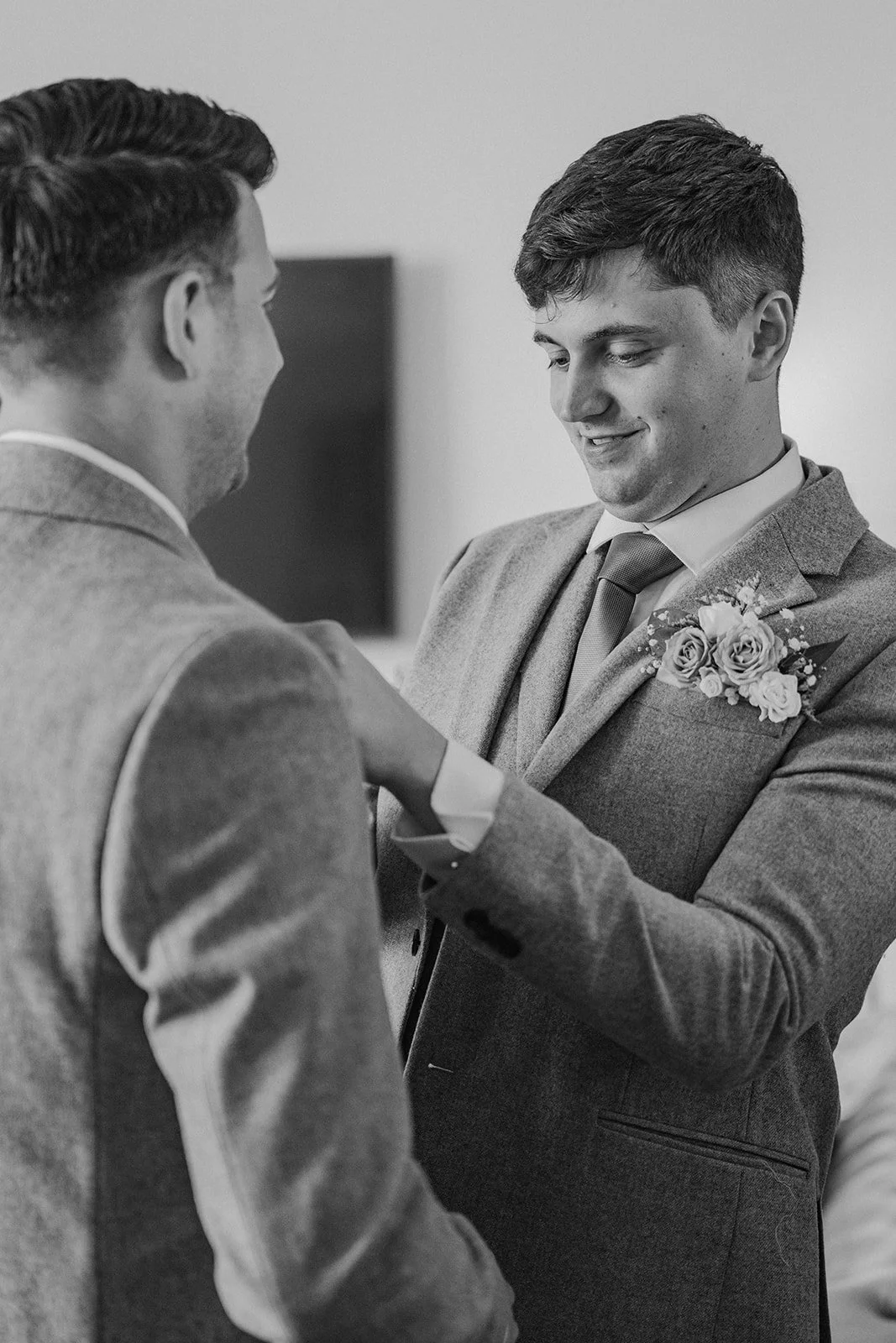 The morning was chilled to perfection. Rhys and Liam got ready in what I’m convinced is the biggest hotel room I’ve ever seen (seriously, you could’ve hosted a mini reception in there). That space meant everyone could stay together without stepping on each other’s toes—and it set the tone for a relaxed, happy morning full of laughter and zero stress.